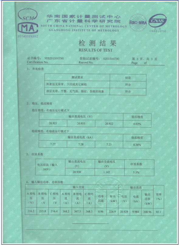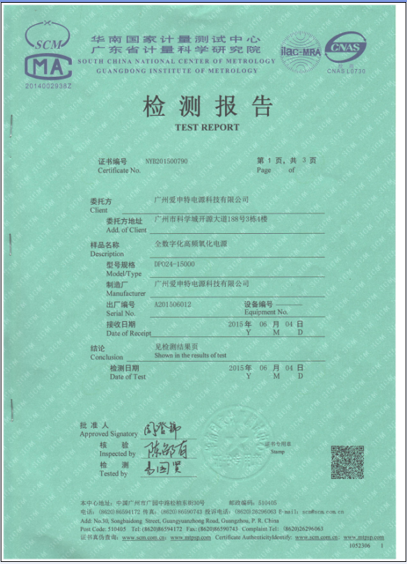热烈庆祝我司全数字化高频氧化电源通过华南国家计算测试中心广东省计量科学研究院检测,检测证明我司产品确实比同类产品高效、节能。
